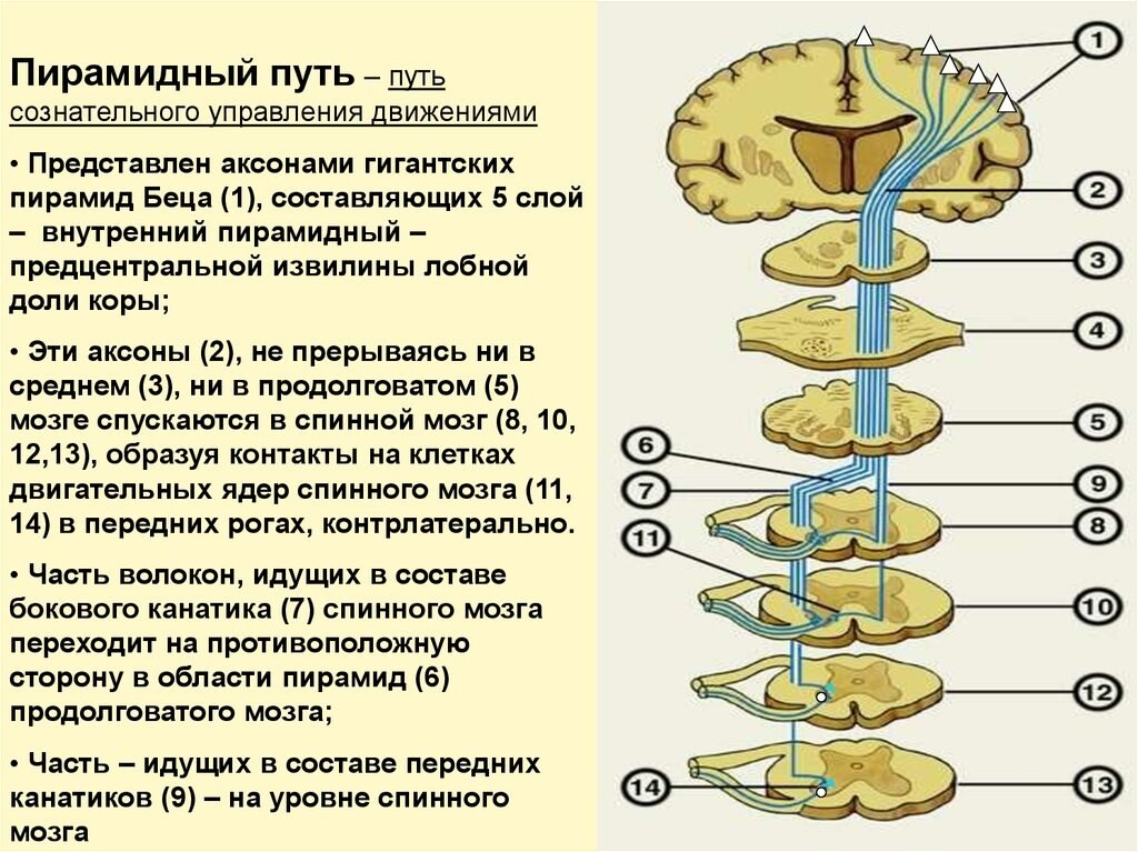 Пирамидный путь – это нервный путь, состоящий из нейронов (нервных клеток), идущих от моторных зон коры головного мозга к спинному мозгу. Нейроны, образующие пирамидный путь, - гигантские (пирамидные) клетки (клетки Беца). Они имеют очень длинные аксоны (отростки), по которым двигательные импульсы от коры доставляются к органам движений. Часть этого пути представлена пучком клеток, образующих кортико-бульбарный (кортико-нуклеарный) путь. Он начинается от коры головного мозга и заканчивается не в спинном мозге, а выше – в продолговатом. Именно в нём находятся ядра черепно-мозговых нервов, иннервирующих (снабжающих нервными импульсами) органы артикуляции. Поэтому очень часто патогенный фактор, повреждающий мотонейроны кортико-спинального пирамидного пути, вызывает нарушения кортико-бульбарного пути, что приводит к появлению дизартрии.